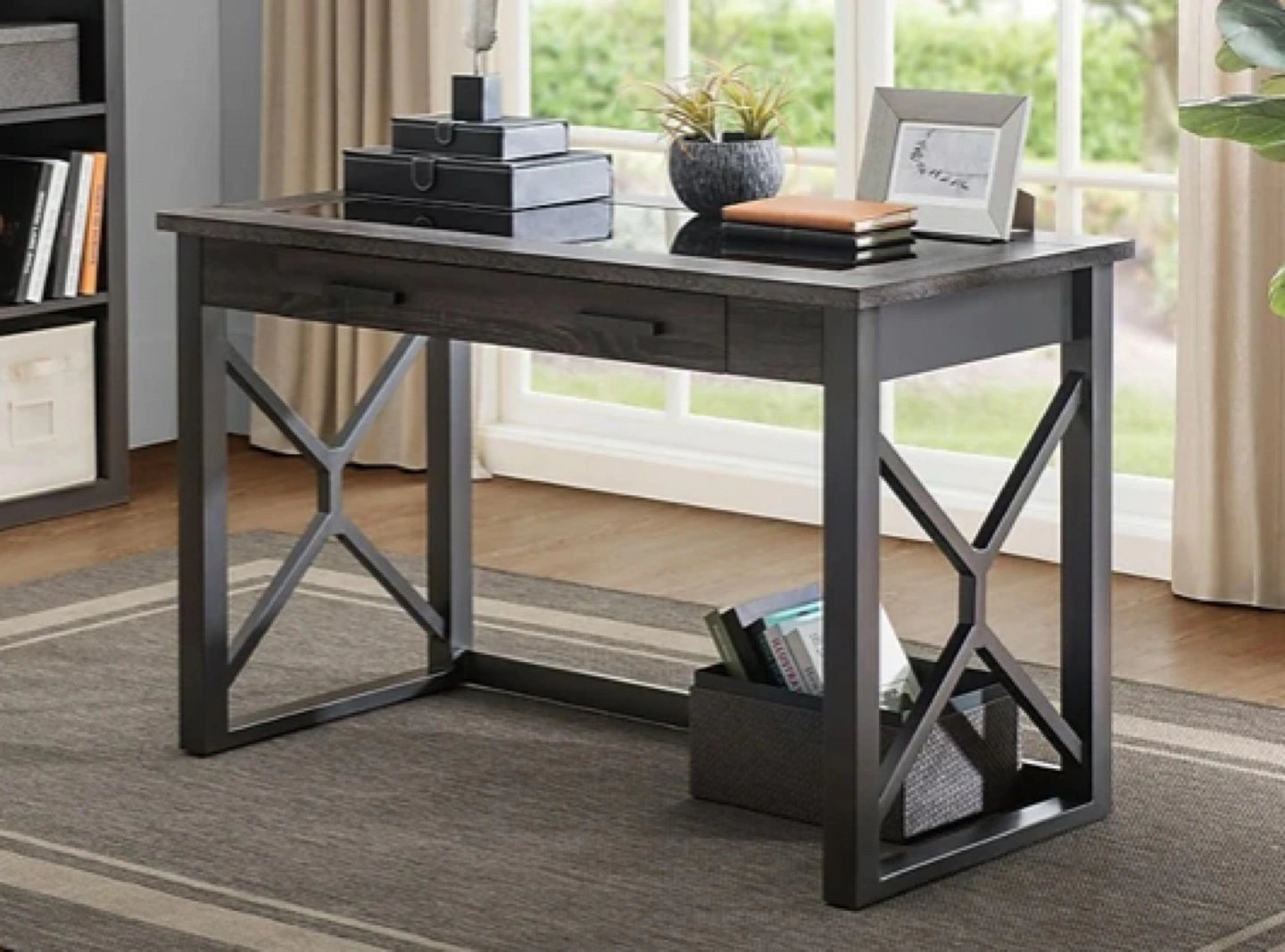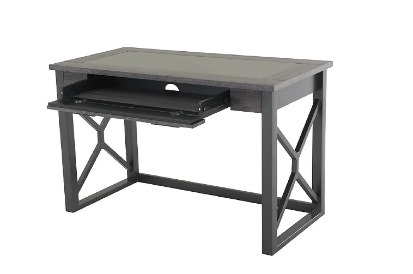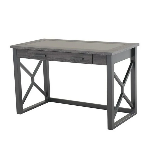 The Ridgecrest desk's transitional design blends well with most any home or office decor. This versatile desk features rich, textured charcoal laminate finish, sturdy steel base frame support, and tempered black glass. Assembly is quick and easy thanks to the fully assembled desk top.
